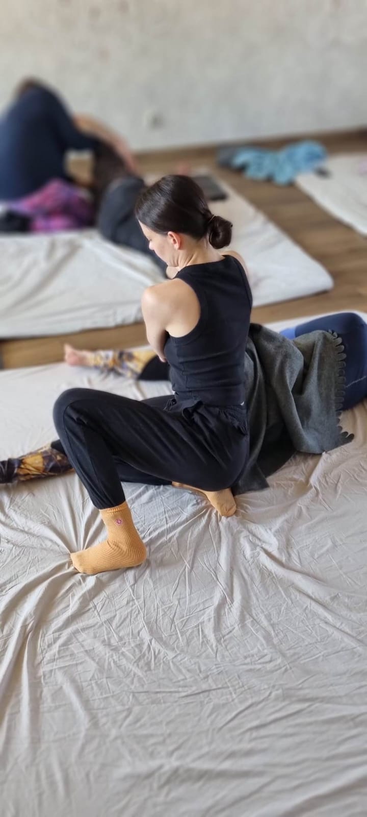 - odcinek lędźwiowy, piersiowo krzyżowy, łopatki, masaż linii sen w rękach, rozciąganie, bujanie, naciąganie, bierna joga, obroty ciała